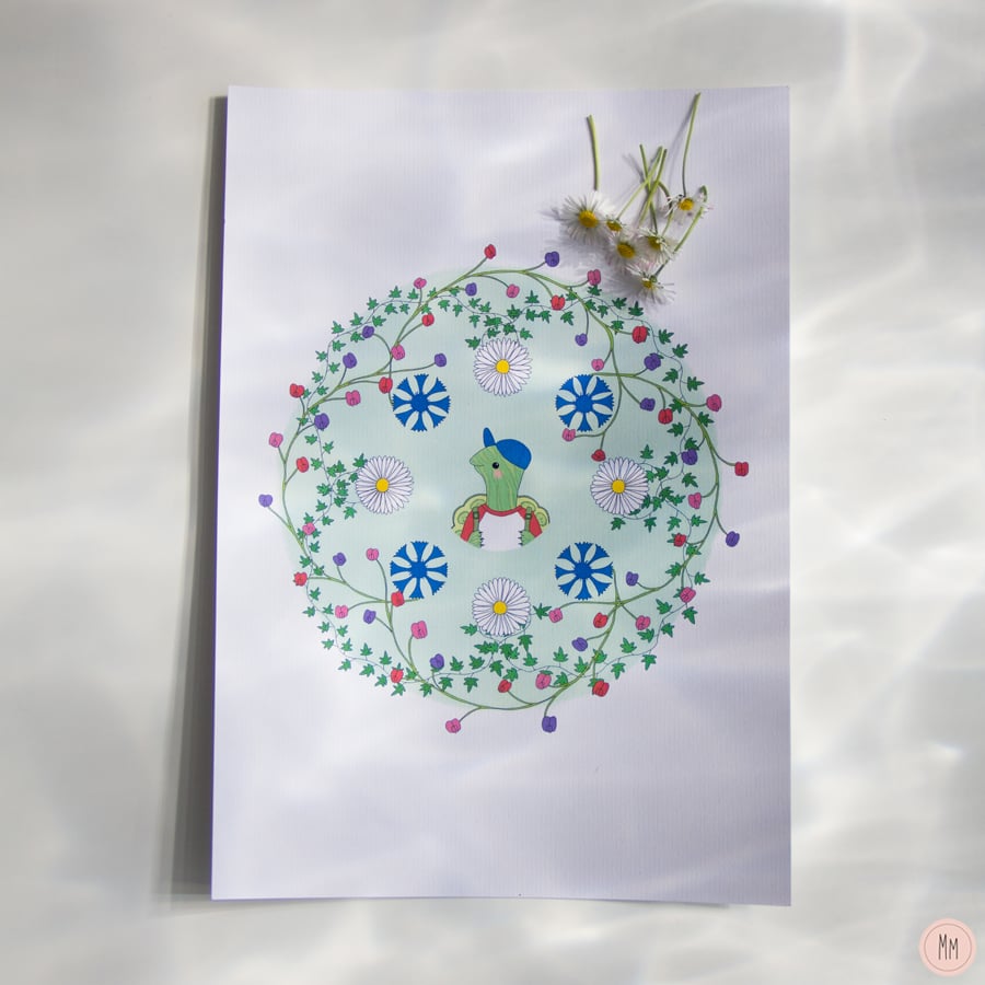 Una tortuga preparada para una excursión primaveral con las flores que aparecen en el mes de Abril formando un mandala a su alrededor.